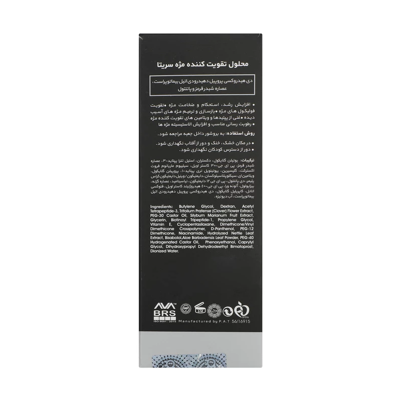 محلول تقویت کننده مژه سریتا، یکی از تخصصیترین محصولات موجود در بازار برای درمان ریزش مژه و افزایش طول، حجم و ضخامت آن ها است. یکی از ترکیبات به کار رفته در این محصول شبدر قرمز است که با داشتن خاصیت آنتی اکسیدانی باعث مهار رادیکالهای آزاد میشود. این محصول به واسطه داشتن ویتامینهای B3 و B5 علاوه بر افزایش انرژی رسانی به تارهای مژه باعث رطوبت رسانی به آن ها و جلوگیری از خشکی مژه میشود.